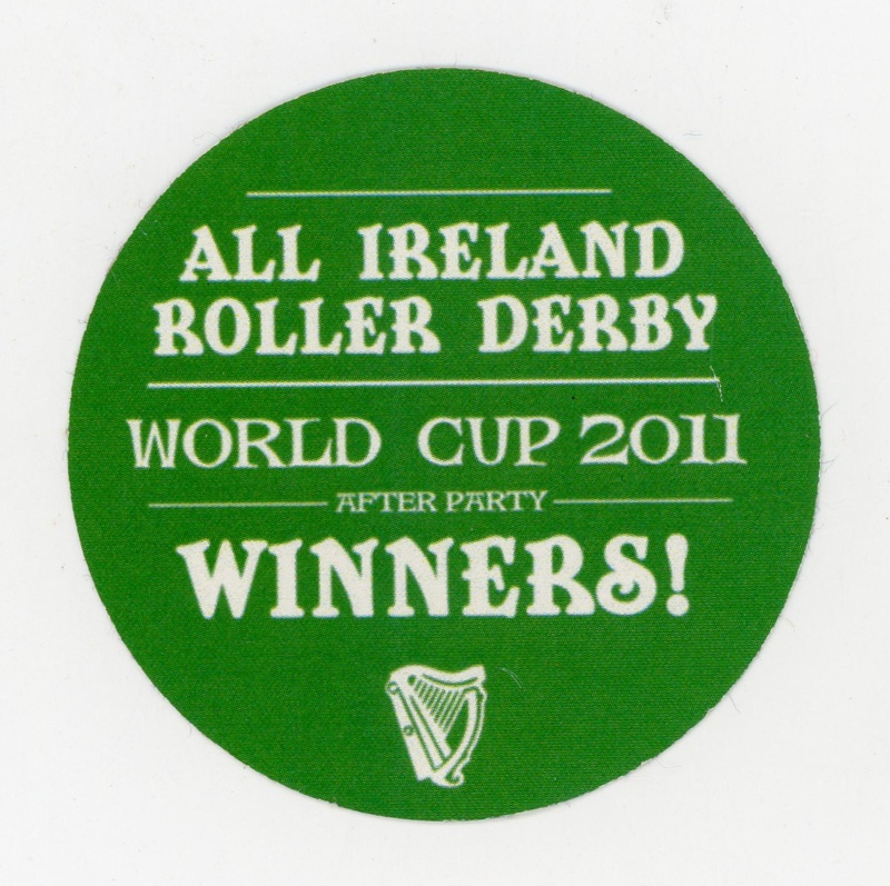 About this objectSmall round sticker on adhesive backing, with a green background featuring a small harp motif below the words 'ALL IRELAND ROLLER DERBY ~ WORLD CUP 2011 After Party WINNERS!' in white.